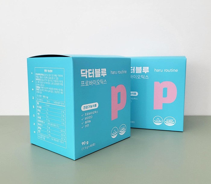 형태/종류 닥터블루 프로바이오틱스 건강기능식품 포장 상자 B형 삼면 단상자재질/인쇄사양 RIV 350g / 별색 2도+먹 1도 / 무광코팅 / 삼면접착